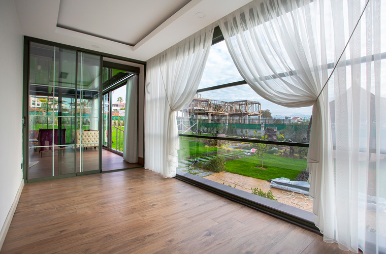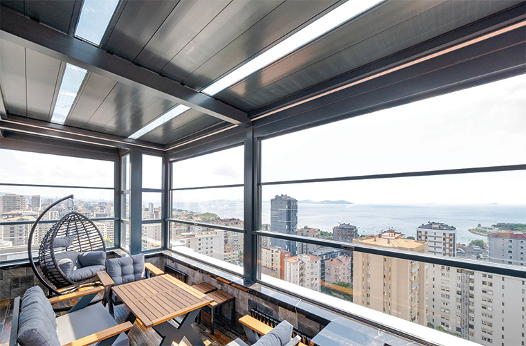 Matek Grup Upglass, patentli ekstra destek profiliyle, 5000 mm genişliğe kadar tekli modül olarak uygulanabilmektedir. Bu geniş açılı cam paneller, kesintisiz bir manzara sunar.