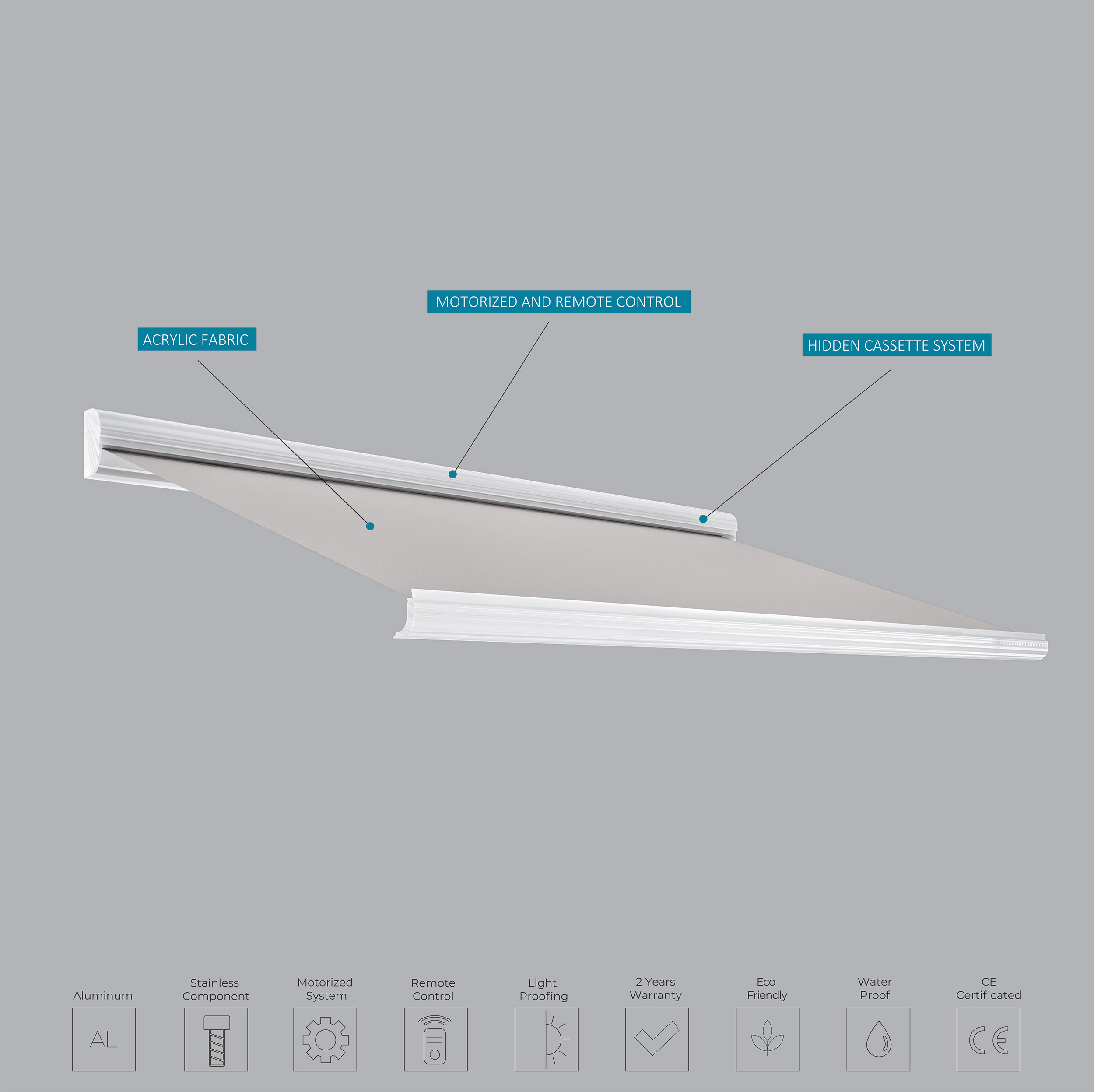 Matek Grup Uptown, motorlu mekanizması, özel kumaşı ve tasarımıyla çok kompakt bir modeldir. Gölgelendirme sistemi, yağmur, rüzgar, soğuk ve kara karşı en yüksek seviyede koruma sağlar. Şık kasetler, kumaşı korumak, ömrünü uzatmak ve minimalist bir etki oluşturmak için tasarlanmıştır.